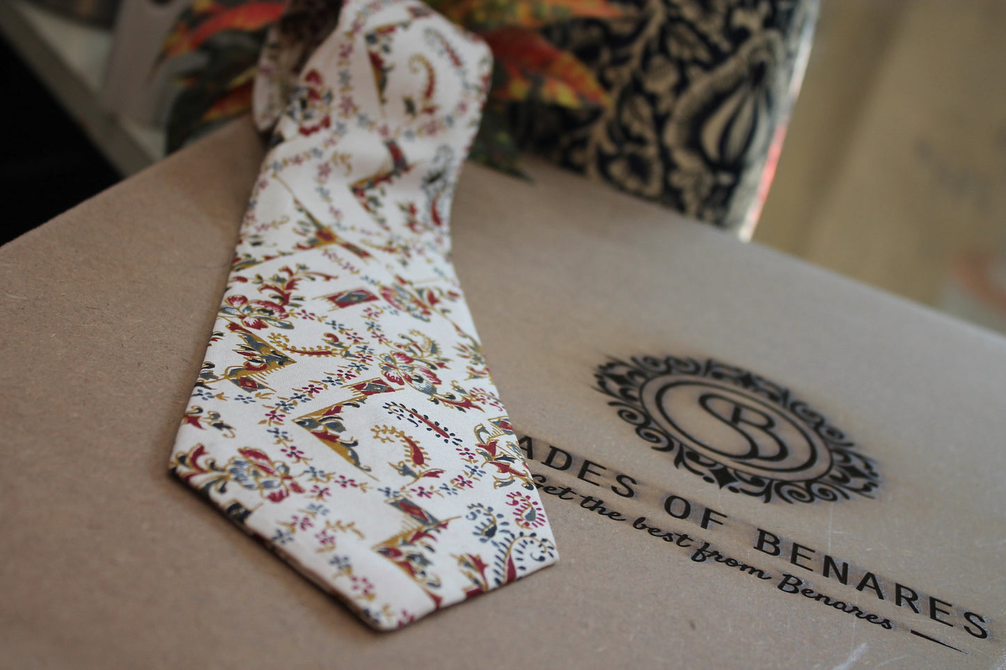 Elegant white Banarasi silk neck tie exudes timeless sophistication and elegance with its classic hue and intricate floral design on pure raw silk. Chic minimalism and versatility make it a stylish accessory suitable for various occasions. Meticulously handcrafted to showcase the beauty of the floral print and the rich heritage of Banarasi silk, this accessory combines tradition with modern flair for a luxurious addition to your wardrobe.
