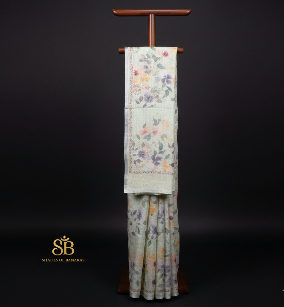 Luxe Mint Green Pure Linen Banarasi Saree | Hand-Printed Summer Couture