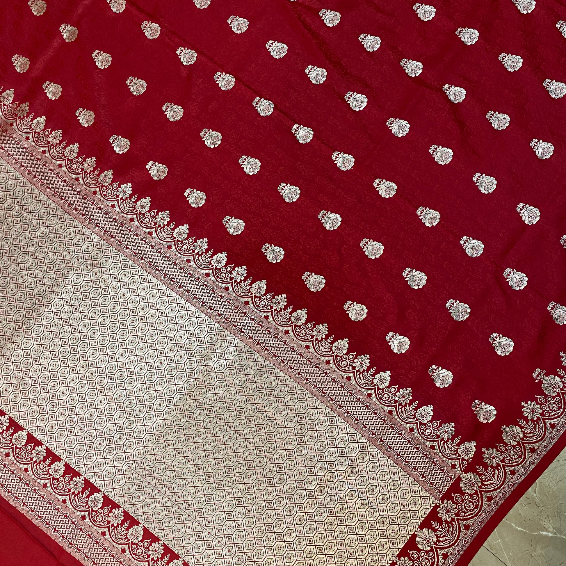 A timeless red Pure Silk Banarasi Saree, detailed with all-over handwoven butis in heritage tanchui weave—ultra-soft, lightweight, and exuding regal luxury for elegant summer wear.