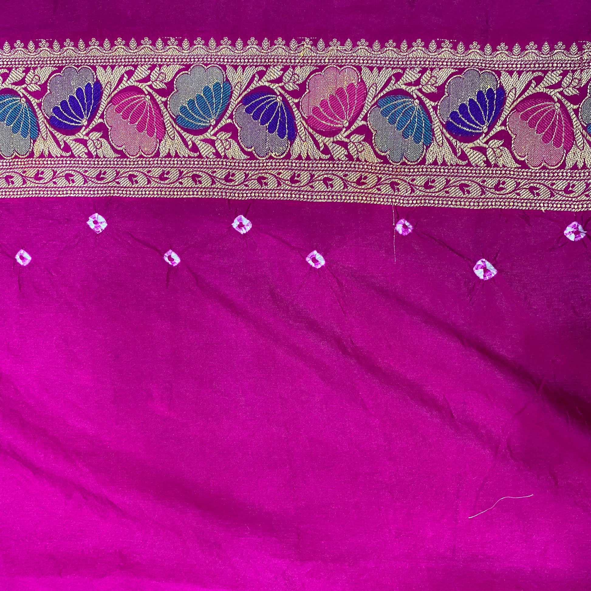 Delicate bandhani meets intricate all-over minakari weaving, creating a surface that shimmers softly with every movement. The purity of georgette lends the saree an airy lightness, making it effortless to drape and supremely comfortable for summer wear, while the Banarasi craftsmanship ensures a regal presence that never goes unnoticed.